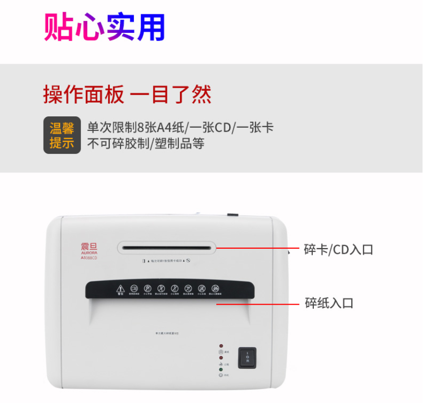 震旦(AURORA) AS088CD多功能碎紙機辦公單次8張碎CD 5級保密低音 白色