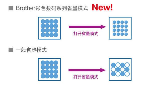 選擇Brother省墨模式可以節省墨粉消耗。兄弟彩色數碼系列省墨模式是通過縮小墨點空間來完成的,墨點的數量沒有改變,即使使用了省墨模式也不會影響打印質量。