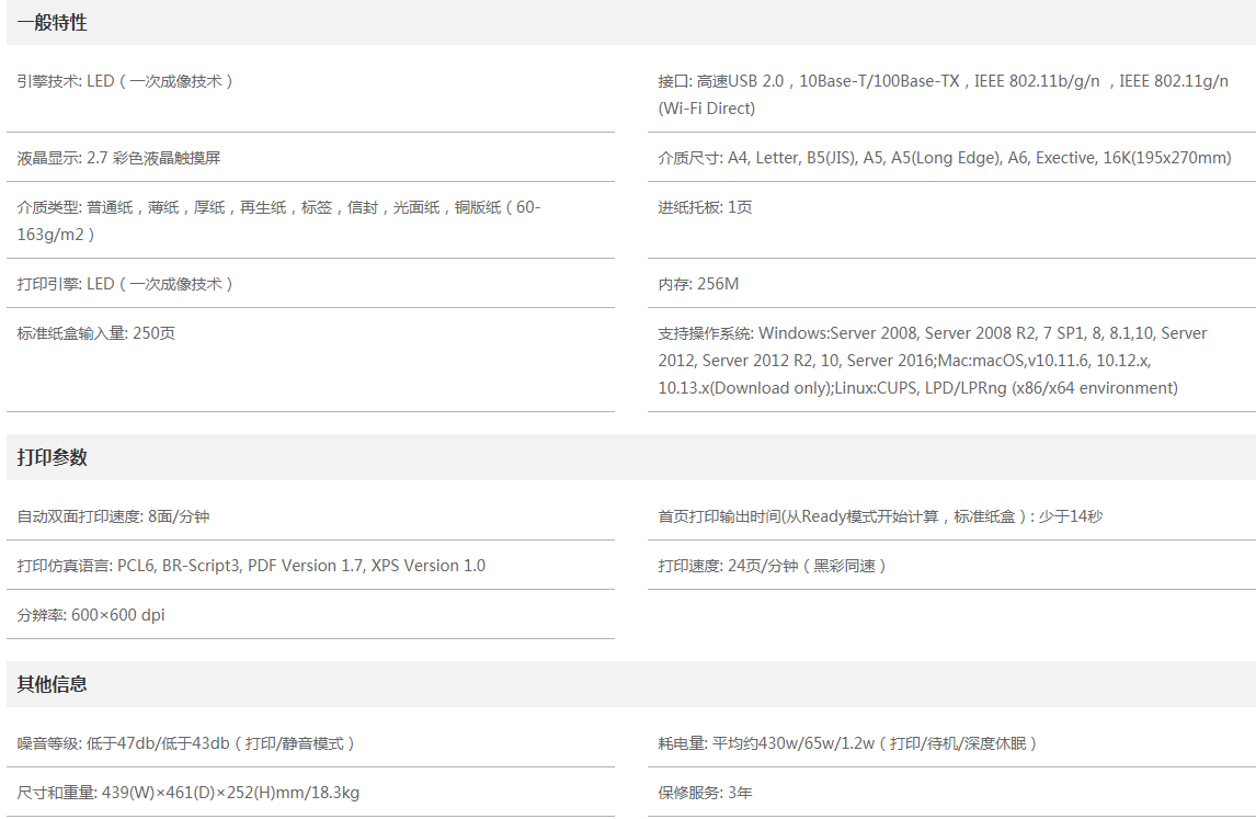 ● PCL6, BR-Script3, PDF Version 1.7, XPS Version 1.0高級打印語言
