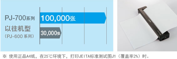 機(jī)器壽命達(dá)到A4尺寸約100000張※,達(dá)到以往機(jī)型的3倍以上。可長(zhǎng)期放心使用。