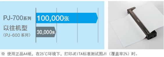 機器壽命達到A4尺寸約100000張※,達到以往機型的3倍以上。可長期放心使用。