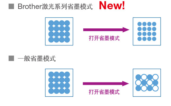 對于日常文檔處理,您也可以通過Brother省墨模式可以節省墨粉消耗。Brother省墨是通過縮小墨點空間來完成,墨點數量沒有改變,即使采用省墨模式也不會影響打印質量。