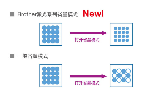 對于日常文檔處理,您也可以通過Brother省墨模式可以節省墨粉消耗。Brother省墨是通過縮小墨點空間來完成,墨點數量沒有改變,即使采用省墨模式也不會影響打印質量。