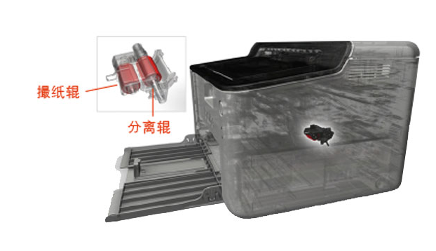 采用在機身內置兩個輥軸,分別為撮紙輥和分離輥,讓紙張在走紙的過程中,大大降低由于多頁進紙而造成的卡紙的機率。