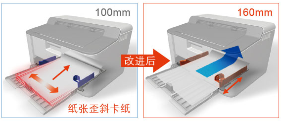 導塊從100mm增長至160mm,確保紙張從走紙直至打印引擎都能平整,減少紙張歪斜的煩惱。
