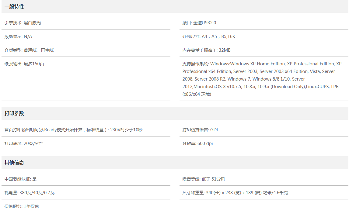高達20頁/分鐘的打印速度,使您的文檔輸出迅速快捷;高達600dpi的打印分辨率,打消您打印質量不佳的顧慮。