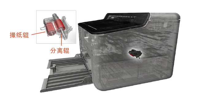 采用在機(jī)身內(nèi)置兩個輥軸,分別為撮紙輥和分離輥,讓紙張?jiān)谧呒埖倪^程中,大大降低由于多頁進(jìn)紙而造成的卡紙的機(jī)率。